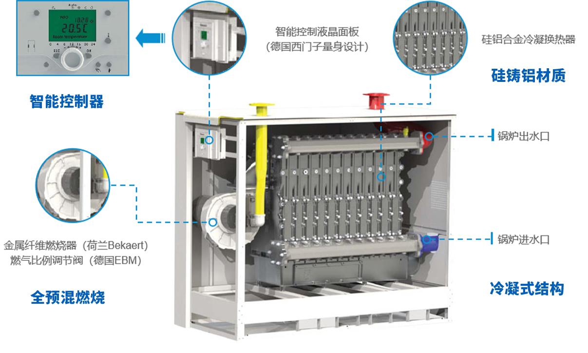 歐洲整機原裝進口,矽鋁合金換熱器,抗腐蝕性強,壽命有保證,德國SIEMENS控製器,命令Ⅲ級輸出,檢測輸出信號,執行過程更有11重安全保護,確保燃燒工況,安全無隱患,更有15~100%無極變頻調節功能,提高使用體驗。