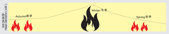 考(kao)慮(lv)到(dao)寒(han)冷(leng)時(shi)供(gong)暖(nuan)的(de)要(yao)求(qiu),安(an)裝(zhuang)在(zai)建(jian)築(zhu)物(wu)內(nei)的(de)鍋(guo)爐(lu)功(gong)率(lv)取(qu)決(jue)於(yu)熱(re)負(fu)荷(he)。而(er)隻(zhi)有(you)在(zai)冬(dong)季(ji)有(you)限(xian)的(de)時(shi)間(jian)段(duan)供(gong)暖(nuan)需(xu)求(qiu)大(da),因(yin)此(ci)裝(zhuang)機(ji)功(gong)率(lv)對(dui)平(ping)常(chang)供(gong)暖(nuan)需(xu)求(qiu)綽(chuo)綽(chuo)有(you)餘(yu),這(zhe)使(shi)鍋(guo)爐(lu)跨(kua)季(ji)時(shi)的(de)平(ping)均(jun)性(xing)能(neng)相(xiang)當(dang)差(cha)。如(ru)果(guo)用(yong)於(yu)提(ti)供(gong)生(sheng)活(huo)熱(re)水(shui),性(xing)能(neng)將(jiang)更(geng)差(cha)。改(gai)善(shan)性(xing)能(neng)的(de)方(fang)法(fa)是(shi)使(shi)用(yong)模(mo)塊(kuai)組(zu)合(he)熱(re)源(yuan),按(an)係(xi)統(tong)要(yao)求(qiu)有(you)效(xiao)地(di)提(ti)供(gong)熱(re)源(yuan)。